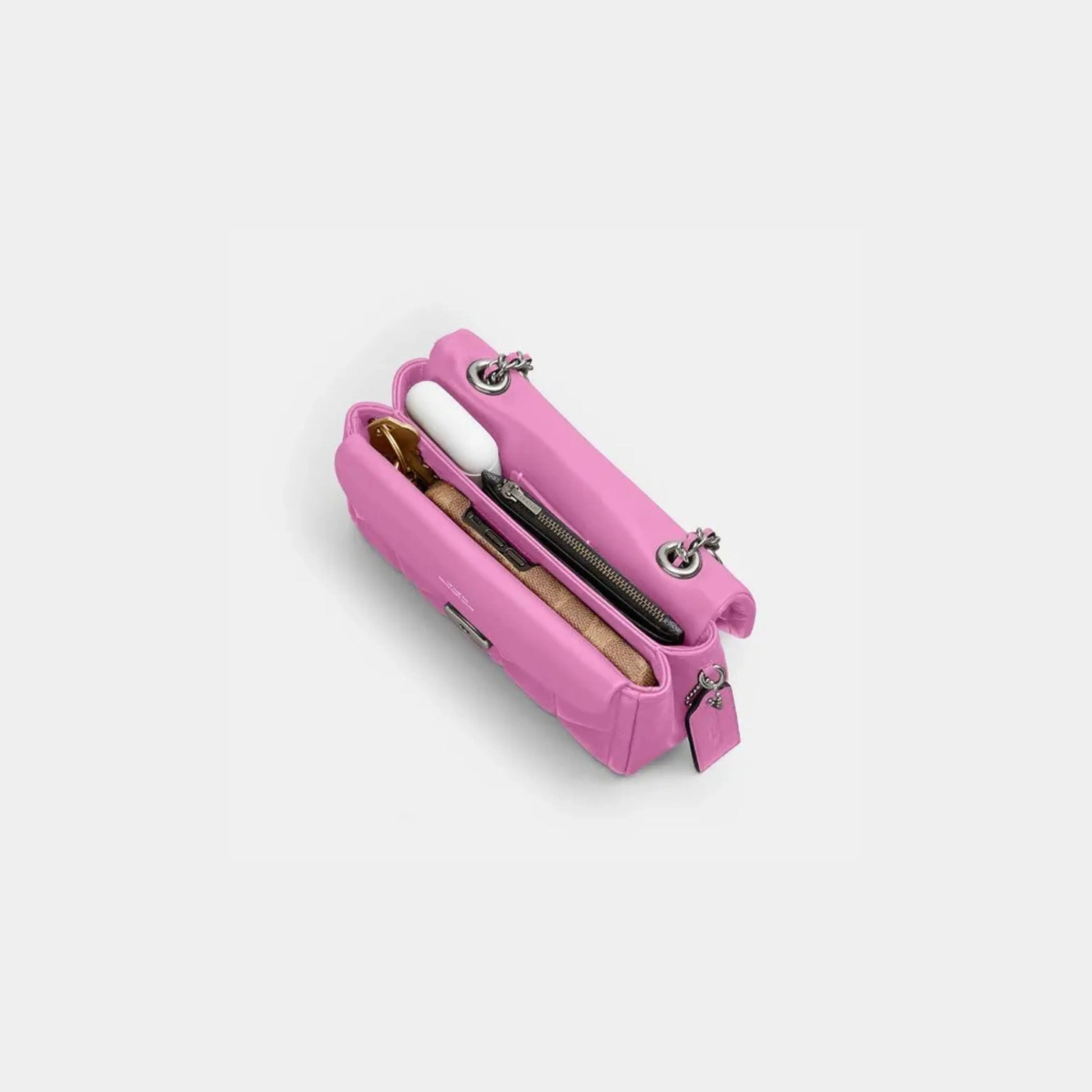 This contemporary shoulder bag is a structured accessory inspired by a classic 1970s design. Slightly smaller than the size 20, it features a long chain strap with leather detail, allowing it to be worn crossbody or doubled for a shorter shoulder look. Finished with discreet hardware and a secure push-lock closure, the bag offers practical compartments that combine style and functionality for everyday use.